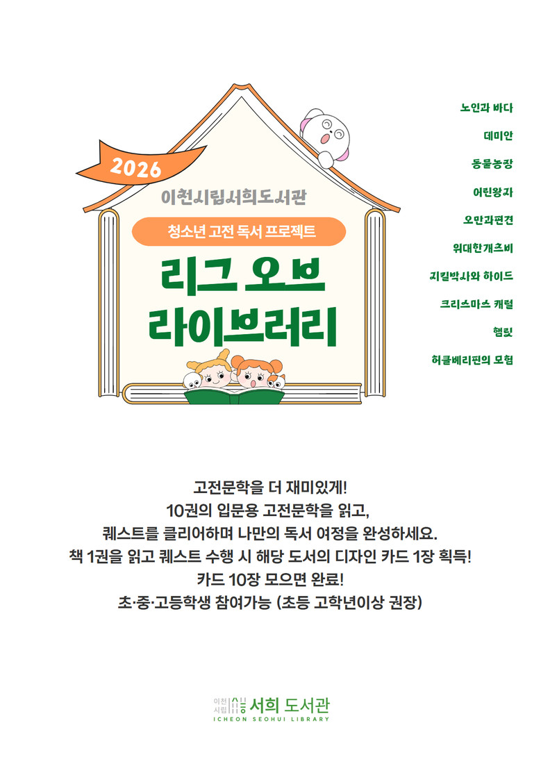 이번 프로그램은 2025년 이천시 독서문화브랜드 ‘이천이책’ 사업의 일환으로 운영되었던 청소년 독서 챌린지 ‘리그 오브 라이브러리’의 성과를 바탕으로, 운영 주체를 서희도서관으로 전환하여 지속 추진하는 사업이다.