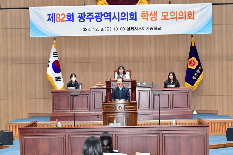 [광주 세계타임즈=손권일 기자] 광주광역시의회(의장 정무창)는 12월 8일(금) 오전 10시 시의회 본회의장에서 살레시오여자중학교 학생들을 대상으로 ‘광주광역시의회 제82회 학생 모의의회’를 개최했다.