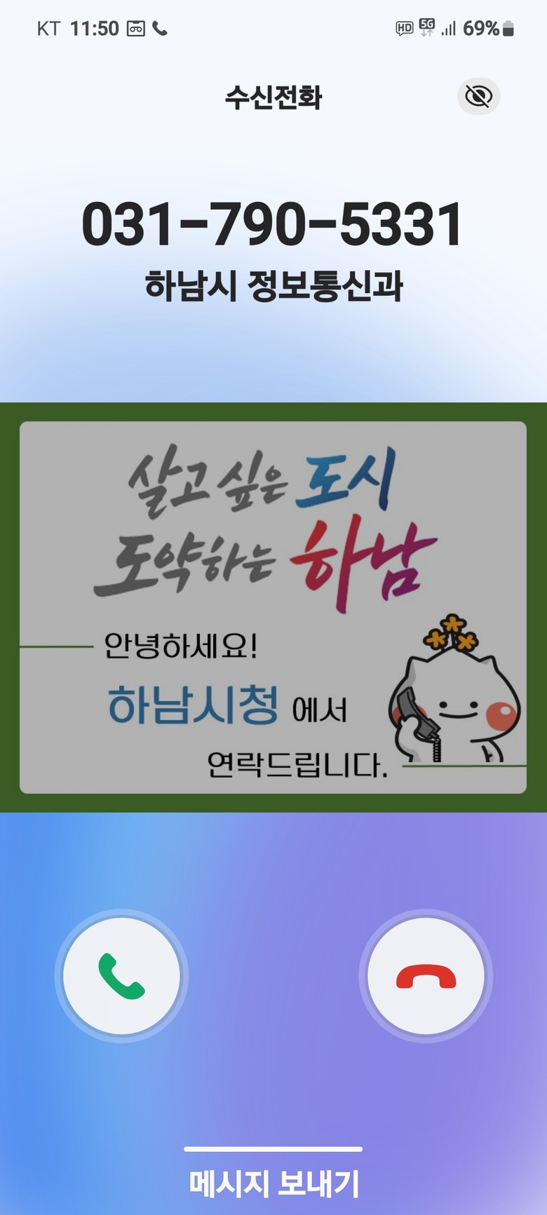 이에 하남시는 민원업무가 많은 부서를 중심으로 총 200회선에 해당 서비스를 우선 적용했다. 앞으로 시청에서 전화를 받을 경우, 시민의 휴대전화 화면에는 ‘하남시청 정보통신과’ 등 발신 부서명이 함께 표시돼 행정기관임을 즉시 확인할 수 있다.