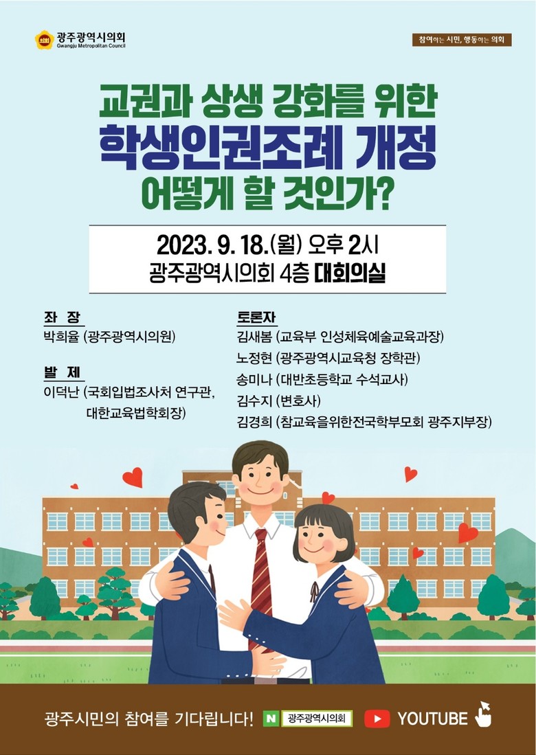 박희율 의원이 좌장으로 이덕난 대한교육법학회장·국회 입법조사연구관이 발제를 맡고, 김새봄 교육부 인성체육예술과장, 노정현 시교육청 장학관, 송미나 한국교육정책연구소장, 김수지 변호사, 김경희 참교육학부모회 광주지부장 등이 토론자로 참석한다.