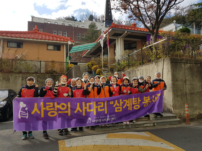 경남아파트 경로당 주용식 총무는 “오늘 추운날씨에 사랑의 사다리 밴드에서 삼계탕 닭죽 묵무침 부침개를 지원해 주어서 큰힘과 위안이 된다.”면서 감사함을 전했다.