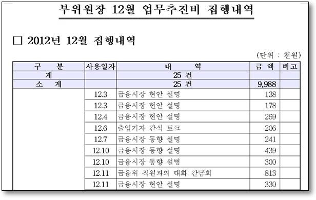 이 비용은 명목상으로는 ‘금융위 현안 설명’, ‘금융시장 동향 설명’, ‘금융정책 현안 간담회’등으로 대부분 식비로 사용된 것으로 추정된다. 이러한 지출이 임기 동안* 매월 20-30회 406회 있었는데, 회당 평균 29만 8천원을 썼다. 다른 부위원장들도 대체로 매월 비슷한 용도와 횟수로 사용했지만 회당 사용액은 추 후보자보다 훨씬 적었다.