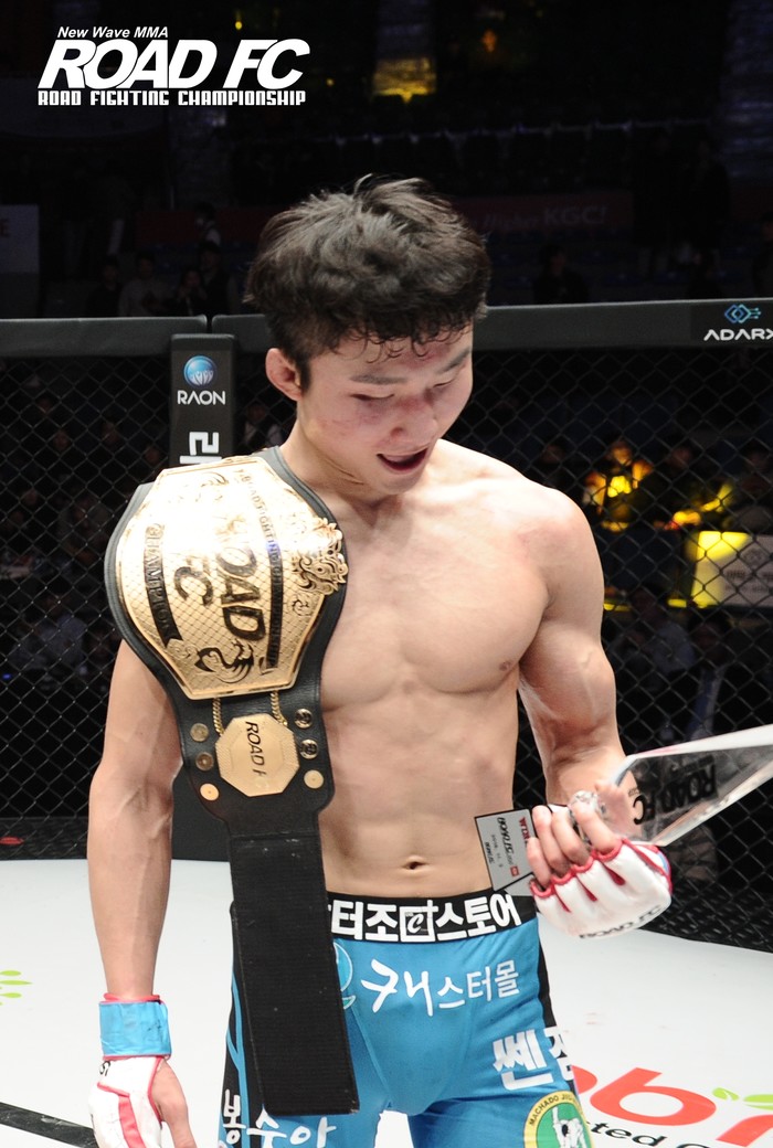 지난해 11월 3일, 이정영은 3차 방어의 기록을 가지고 있던 페더급 챔피언 최무겸(30, 최무겸짐)을 제압했다. 이날 승리로 이정영은 페더급 정상에 오르면서 ROAD FC 역대 최연소 챔피언 기록도 갈아치웠다. 이정영의 기록은 만 22세 11개월 22일이다.