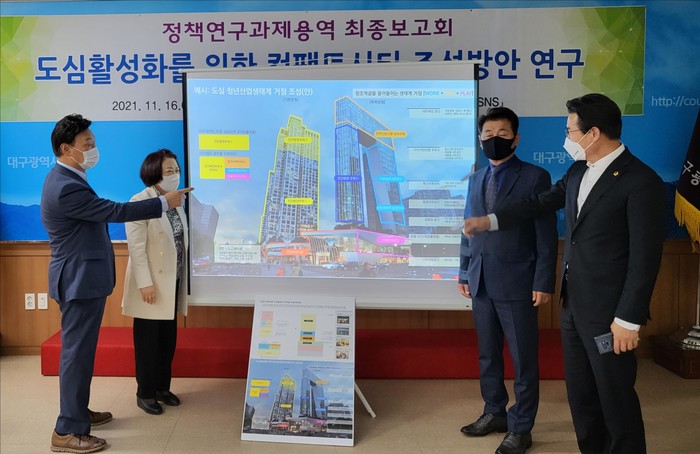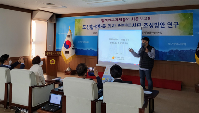 [대구=세계타임즈 한성국 기자] 대구광역시의회의 의원연구단체인 『소통하는 SNS』가 지난 16일 오후 4시, 시의회 2층 간담회장에서 ‘원도심 활성화를 위한 컴팩트 시티 조성 방안 연구’ 용역의 최종보고회를 열어 노후한 원도심 상업지역의 활성화 및 발전전략을 논의했다. 보고회에서는 우수한 입지를 가진 원도심에 민간사업에서의 공공기여 유도를 통해 정주여건을 획기적으로 개선하는 등 원도심을 청년산업생태계 거점으로 발전시키자는 방안이 제시되었다.