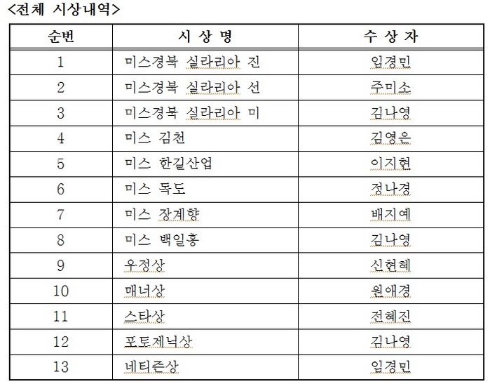 이날 대회에서는 임경민씨가 미스경북 실라리안 진(眞)의 왕관을 차지했으며, 미스경북 실라리안 선의 영예는 주미소, 미스경북 실라리안 미는 김나영씨가 각각 차지했다. 이들 3명은 오는 7월 4일 서울 올림픽공원에서 열리는 『2018 미스코리아 선발대회』에 경북대표로 출전하게 된다.