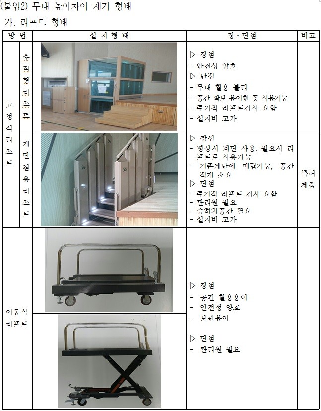 - 전용 공연장이 아닌 체육관 등으로 함께 사용되는 학교의 특성과 각 학교별 무대 높이, 설치 공간 등을 고려하여 고정식 리프트, 이동식 리프트·경사로 중 적절한 형태 설치 추진
