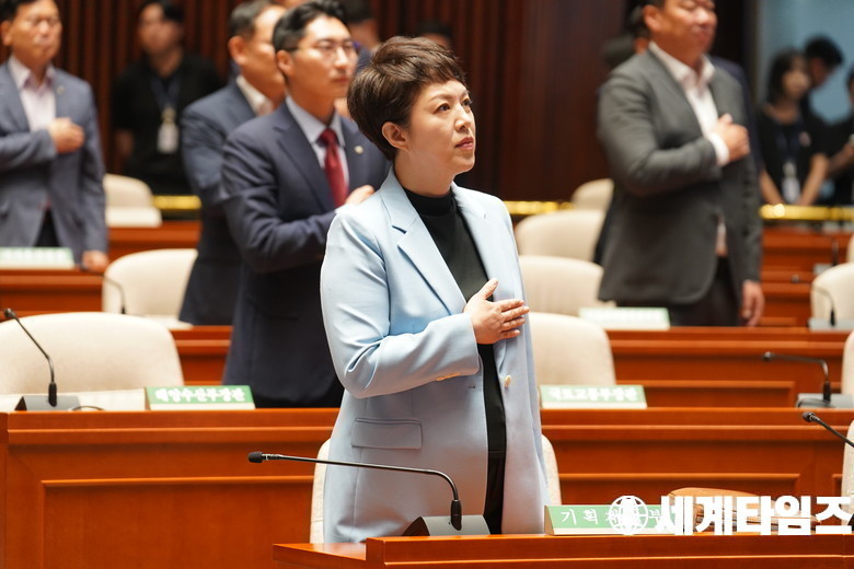 '김은혜' 국민의힘 의원이 23일 오전 서울 여의도 국회에서 열린 의원총회에서 국기에 대한경례를 하고있다.
