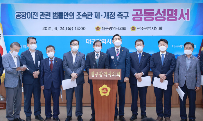 양 의회는 공동으로 작성한 성명서에서 ①국회는 ‘대구경북신공항 건설 특별법안’과 ‘군공항 이전 및 지원에 관한 특별법 개정안’을 조속하게 처리할 것, ②중앙정부와 정치권은 광주군공항 이전부지 선정 등 조속하고 원활한 사업절차의 추진을 위해 연결 교통인프라 건설 및 배후산업 단지 조성 등 국가 차원의 지원책을 마련할 것, ③국토교통부는 대구경북신공항이 관문공항이 될 수 있는 규모로 ‘공항개발종합계획’에 반영하고, 접근성 개선을 위한 국가철도, 도로 등의 교통인프라 건설을 전폭 지원할 것, ④국방부는 과다한 시설요구에서 비롯된 막대한 사업비용을 재정여건이 열악한 지방정부에 전가하지 말고, 군사시설 설치와 지원사업을 책임있게 추진할 것을 강력하게 촉구했다.