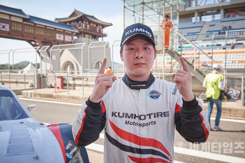 포즈를 취하고 있다슈퍼 6000 클래스 이찬준(엑스타 레이싱)이 경기 후 세레머니 포즈를 취하고 있다
