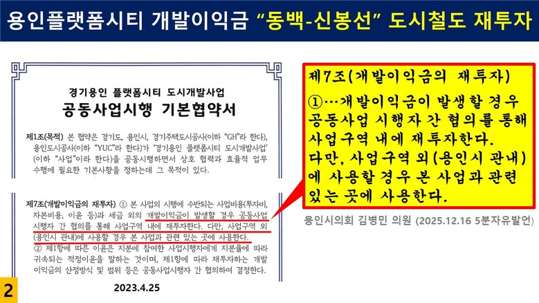 이어, 김 의원은 예산 확보 방안으로 경기용인플랫폼시티 개발이익금의 적극적 활용을 제안했다. 광역교통개선 대책 수립 당시 동백–신봉선이 도시철도망에 반영되지 않아 관련 대책에서 제외됐으나, 경기도와 용인시는 2023년 기본협약 체결을 통해 플랫폼시티 개발이익금 전액을 용인시에 재투자하기로 명문화된 만큼, 해당 재원을 동백–신봉선 건설에 우선 활용해야 한다고 강조했다.