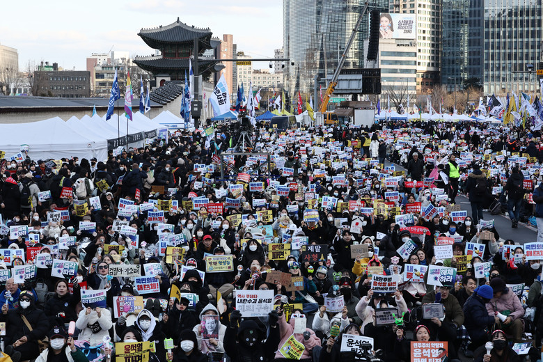 [세계타임즈 = 이장성 기자] 25일 오후 서울 광화문에서 윤석열 즉각 퇴진·사회 대개혁 비상행동 주최로 열린 대통령 퇴진 촉구 집회에서 참석자들이 관련 구호를 외치고 있다. 2025.1.25