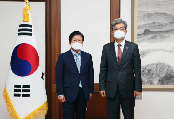 [세계타임즈 이영진 기자]박병석 국회의장은 17일 오전 의장집무실에서 김상환 신임 법원행정처장의 예방을 받고 “억울한 국민이 마지막으로 기댈 곳이 사법부”라며 “처장의 탁월한 전문성과 소통능력으로 사법개혁을 포함해 국민이 신뢰할 수 있는 사법부가 되길 바란다”고 당부했다.