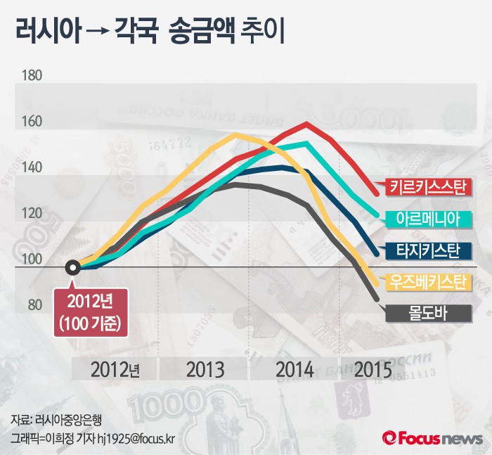 (서울=포커스뉴스) 유가 하락으로 러시아 경제가 어려워지면서 러시아에서 일하는 우즈베키스탄, 타지키스탄 등 옛 소비에트 연방 국가들의 노동자들 본국 송금액이 크게 줄고 있다.