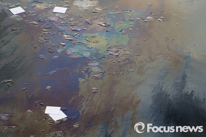 (서울=포커스뉴스) 26일 오후 서울 한강 영동대교 아래에서 침수된 한강유람선에서 기름이 유출되고 있다.