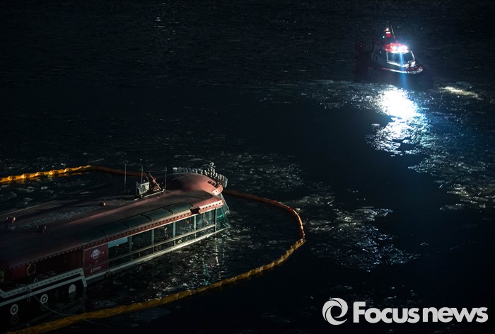 (서울=포커스뉴스) 26일 오후 서울 한강 영동대교 아래에서 한강유람선이 침수된 가운데 관계당국이 침수된 배의 선수를 살펴보고 있다.