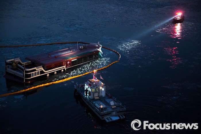 (서울=포커스뉴스) 26일 오후 서울 한강 영동대교 아래에서 한강유람선이 침수되어 관계 당국이 기름 유출을 막기 위해 방재작업을 하고 있다.