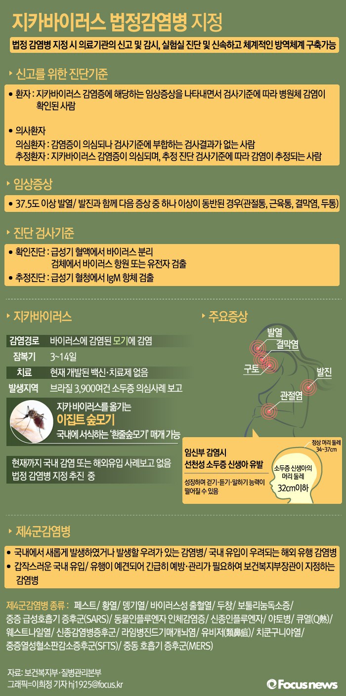 (서울=포커스뉴스) 질병관리본부는 ‘소두증 바이러스’라고 불리는 지카바이러스(Zika virus) 감염증을 제4군 법정감염병으로 지정한다고 29일 밝혔다. 지카바이러스 감염증이 법정감염병으로 지정됨에 따라 감염증 환자 및 의심환자를 진료한 의료기관은 의무적으로 관할 보건소에 신고해야 한다.