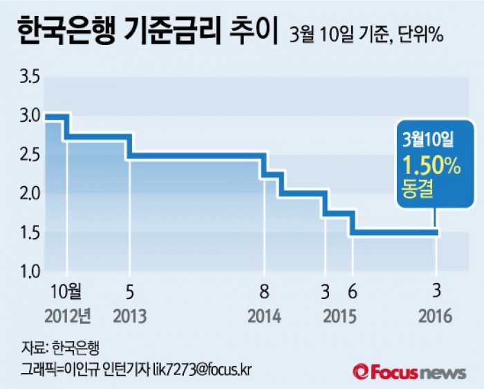 (서울=포커스뉴스) 한국은행 금융통화위원회는 10일 정례회의를 열고 기준금리를 9개월째 1.50%에 동결하면서 경기와 금융시장에 대해 대체로 지난달과 비슷한 시각을 유지했다.