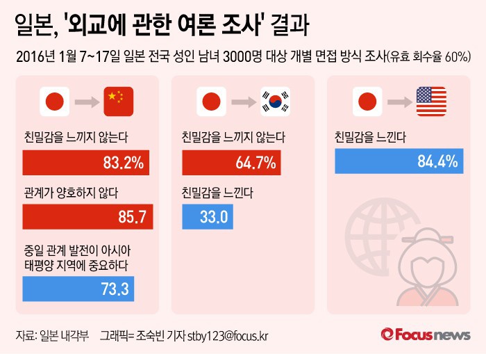 (서울=포커스뉴스) 12일 일본 내각부가 발표한 '외교에 관한 여론 조사'에 따르면 중국에 '친밀감을 느끼지 않는다'고 답한 사람은 83.2%로 1978년 중·일 평화우호조약 체결 이후 사상 최고치다.