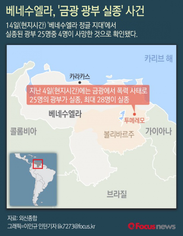 (서울=포커스뉴스) 14일(현지시간) 외신에 따르면 베네수엘라 정글 지대에서 실종된 광부 25명 중 4명의 시체를 확인했다고 15일 보도했다.