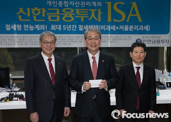 (서울=포커스뉴스) 15일 오후 서울 여의도 신한금융투자 본사 영업점에서 임종룡 금융위원장이 개인종합자산관리계좌(ISA) 가입 후 포토타임을 갖고 있다. 왼쪽부터 황영기 금융투자협회장, 임 위원장, 강대석 신한금융투자 사장.