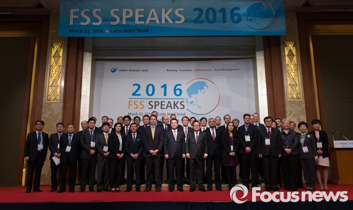 (서울=포커스뉴스) 22일 오전 서울 중구 소공로 롯데호텔에서 진웅섭(앞줄 오른쪽 여섯번째) 금융감독원장을 비롯한 외교사절과 국제 신평사 임원들이 외국계금융회사 대상 업무설명회 'FSS SPEAKS 2016'에 참석해 기념촬영을 하고 있다.
