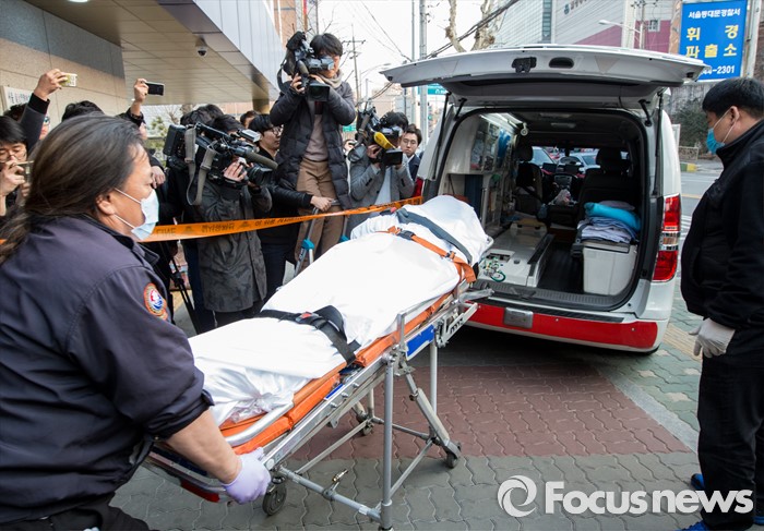 구급차로 향하는 시신