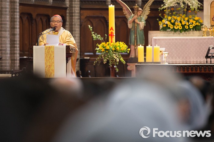 (서울=포커스뉴스) 부활절을 맞아 27일 정오 서울 중구 명동성당에서 염수정 추기경이 '예수 부활 대축일 미사'를 집전하고 있다.