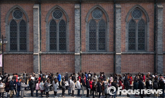 (서울=포커스뉴스) 부활절을 맞아 27일 정오 서울 중구 명동성당에서 신도들이 '예수 부활 대축일 미사'에 참석하기 위해 기다리고 있다.