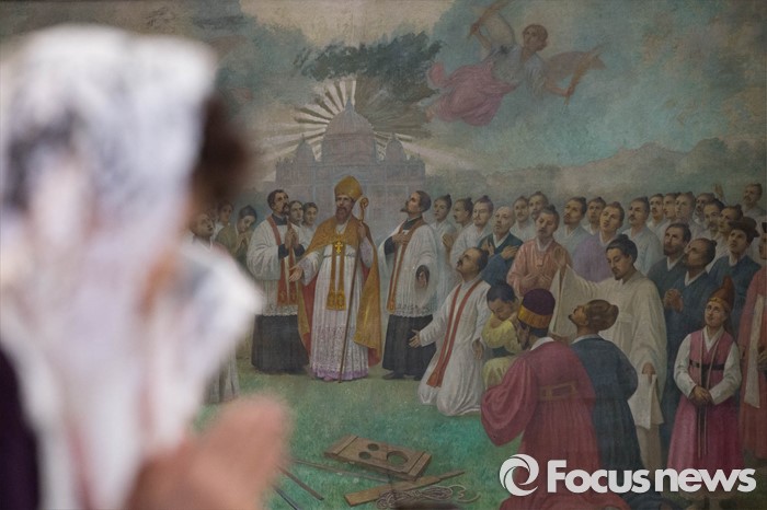 (서울=포커스뉴스) 부활절을 맞아 27일 정오 서울 중구 명동성당에서 열린 '예수 부활 대축일 미사'에 신도들이 참석해 기도하고 있다.