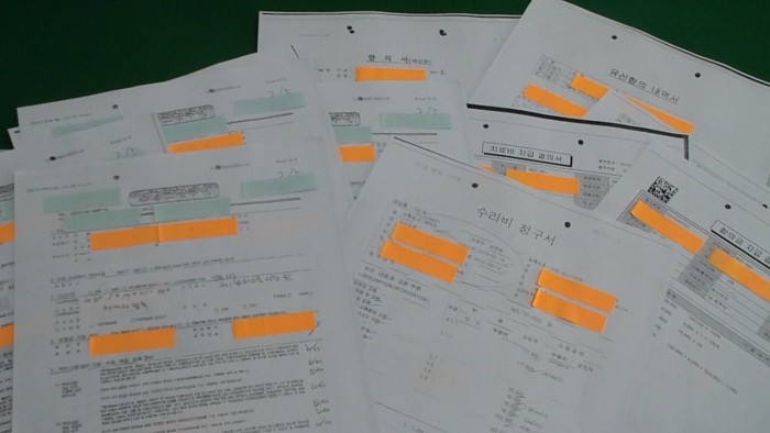 경찰 관계자는 "보험사기 수법이 갈수록 치밀해지고 있어 수사를 강화할 방침"이라고 전했다.지난 2009년부터 2013년까지 34차례에 걸쳐 가족 등과 짜고 허위로 교통사고를 꾸며 보험금을 타낸 보험 대리점주 이모(51)씨가 청구한 보험금 청구 서류. <사진제공=서울 노원경찰서>