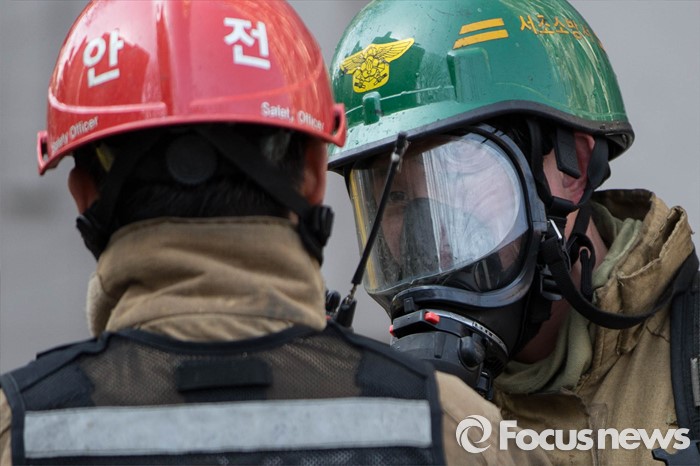 (서울=포커스뉴스) 30일 오후 2시께 서울 서초구의 한 아파트에서 원인모를 불이나 소방관들이 진화작업을 하고 있다.