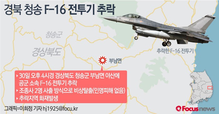 (서울=포커스뉴스) 30일 군 관계자는 "오늘 오후 F-16 전투기 1대가 추락했다"며 "전투기에 타고 있던 조종사 2명은 사출(ejection) 방식으로 비상 탈출했다"고 밝혔다.