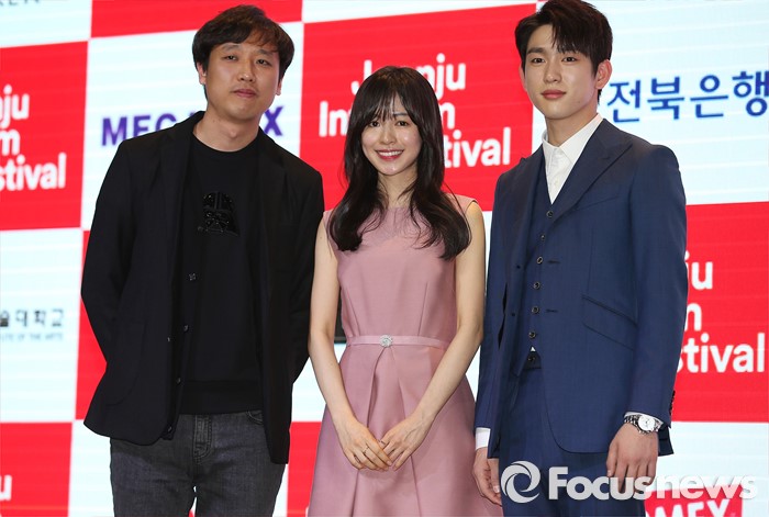 (서울=포커스뉴스) 30일 오후 서울 영등포구 글래드호텔에서 열린 '제17회 전주국제영화제 상영작 발표 기자회견' 에 참석한 영화감독 조재민(왼쪽부터), 배우 지우, 박진영이 포토타임을 갖고 있다.