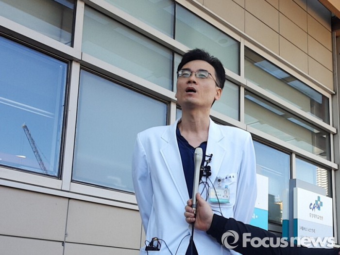 박 경사는 이날 중 중앙대학교병원에서 영등포구 한강성심병원으로 이송될 예정이다.4일 오전 중앙대병원 성형외과 배태희 교수가 염산테러를 당한 박 경사의 상태에 대해 브리핑하고 있다. 2016.04.04 정상훈 기자