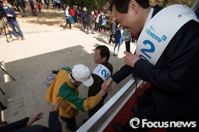 (서울=포커스뉴스) 11일 오후 서울 서대문구 청소년수련관 앞에서 우상호 더불어민주당 서대문구갑 후보가 영화배우 안내상, 우현과 함께 유세를 하고 있다.