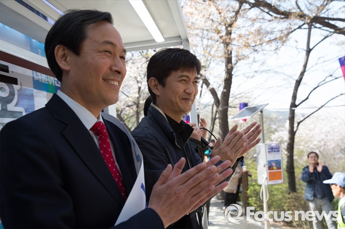 | △ 박수치는 우상호 후보-배우 안내상 |