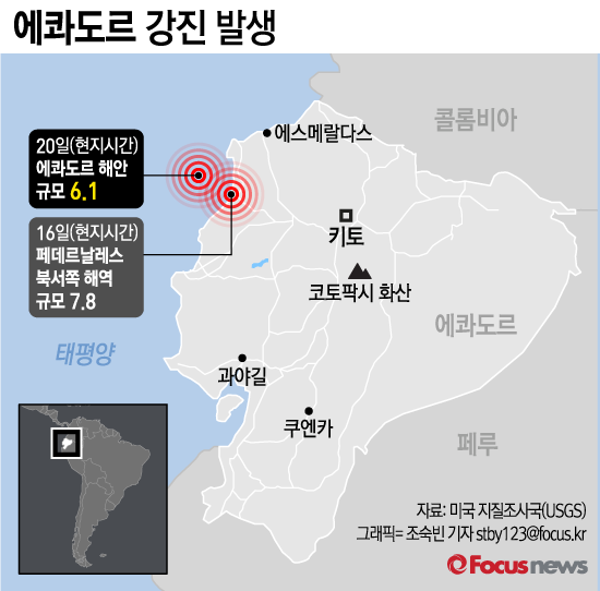 (서울=포커스뉴스) 20일(현지시간) 오후 에콰도르에서 지난 16일 규모 7.8 강진 이후 가장 강력한 규모 6.1 수준의 여진이 발생했다.