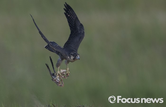 (인천=포커스뉴스) 어린 송골매 수컷이자신이 사냥한비둘기를 띁다가인근의 까마귀들이 몰려들자, 안전한 곳으로 이동하고 있다.