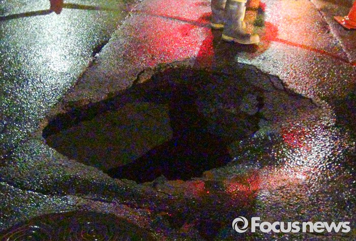(서울=포커스뉴스) 6일 서울 송파경찰서와 소방당국은 전날 오후 11시경 서울 송파구 신천동 파크리오아파트 사거리 도로에서 지름 1.5m, 깊이 1.4m 크기의 지반침하 현상(싱크홀)이 발견됐다고 밝혔다. 이곳은 제2롯데월드와 한 블럭 떨어진 곳으로 작년과 재작년에도 이 일대에서 싱크홀이 잇따라 발생했다. <사진제공= 송파소방서>
