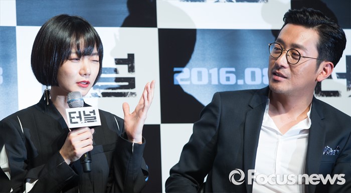 (서울=포커스뉴스) 7일 오전 서울 강남구 압구정 CGV에서 열린 영화 '터널' 제작보고회에 참석한 배우 배두나(왼쪽)가 취재진의 질문에 답하고 있다.
