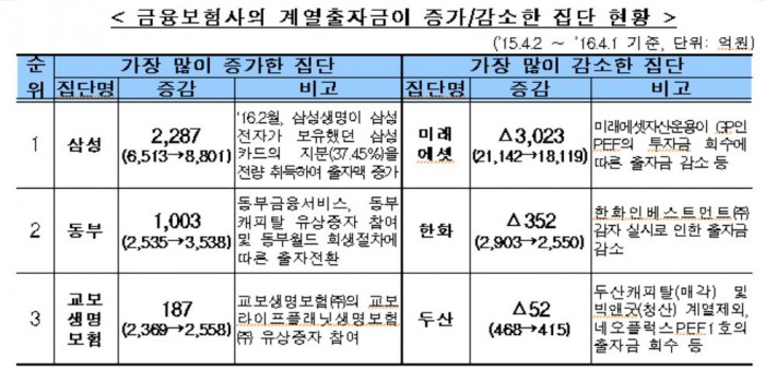전년보다 금융보험사의 계열사 출자금이 가장 많이 감소한 집단은 미래에셋과 한화 순이다. 미래에셋의 계열사 출자금은 2조1142억원에서 1조8119억원으로 3023억원 감소했으며, 한화는 2903억원에서 2550억원으로 352억원 줄었다.