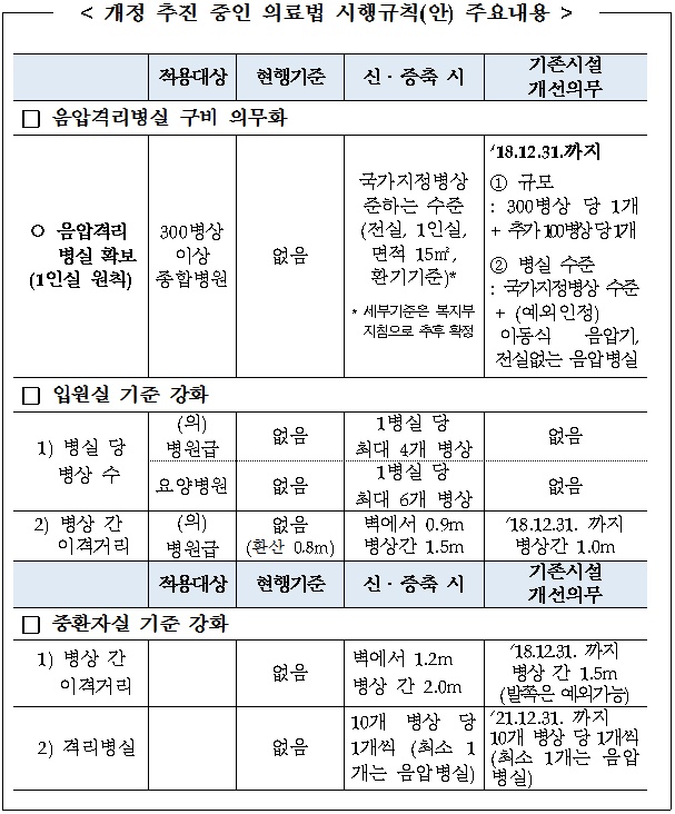 다만, 개정안 시행 후 신축·증축하는 병동에는 반드시 국가지정병상에 준하는 시설의 음압격리병실로 설치해야한다.