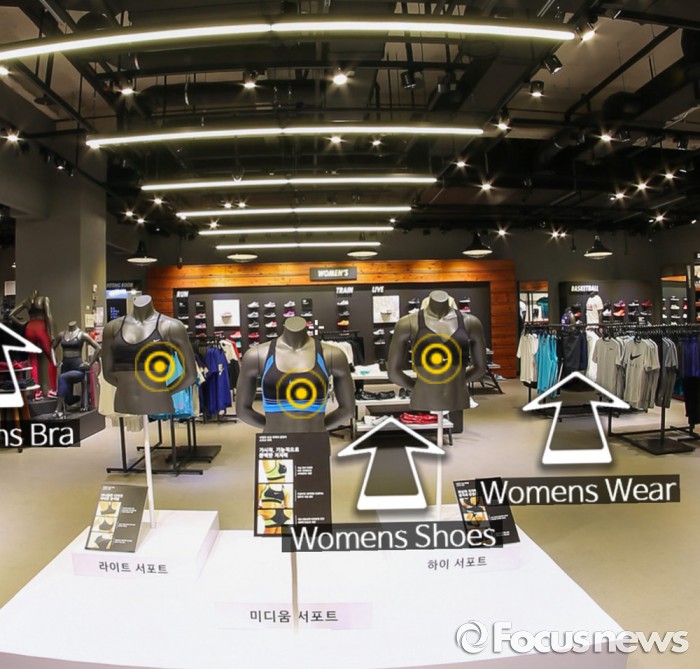 VR화면에 있는 화살표를 응시하면 매장을 이동할 수 있고, 제품을 보면 제품명 등 간단한 제품 정보도 알 수 있다. 올 하반기 중에는 VR기기에서 바로 관심 상품을 등록할 수 있게 시스템을 개발할 예정이다.