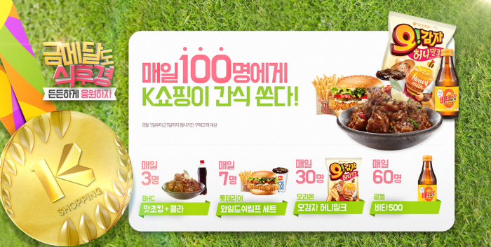 기간 내 1회 이상 K쇼핑 상품을 구매한 고객을 대상으로 별도의 이벤트 응모 없이 매일 100명을 추첨해 BHC맛초킹 치킨·콜라 세트(3명), 롯데리아 와일드쉬림프 버거세트(7명), 오감자 허니밀크(30명), 비타500(60명) 등 다양한 간식을 경품으로 제공한다. 경품은 모바일 쿠폰 기프티쇼로 발송되며, 휴일을 제외하고 다음날 바로 지급된다.2016.08.01 <사진제공=K쇼핑>