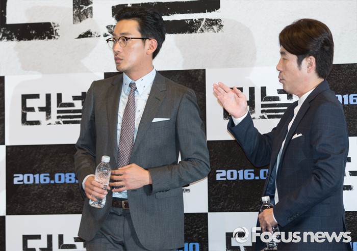 (서울=포커스뉴스) 3일 오후 서울 강남구 메가박스 코엑스점에서 열린 영화 '터널' 언론시사회에 참석한 배우 하정우(왼쪽)와 오달수가 기자간담회를 마친 후 퇴장하고 있다.