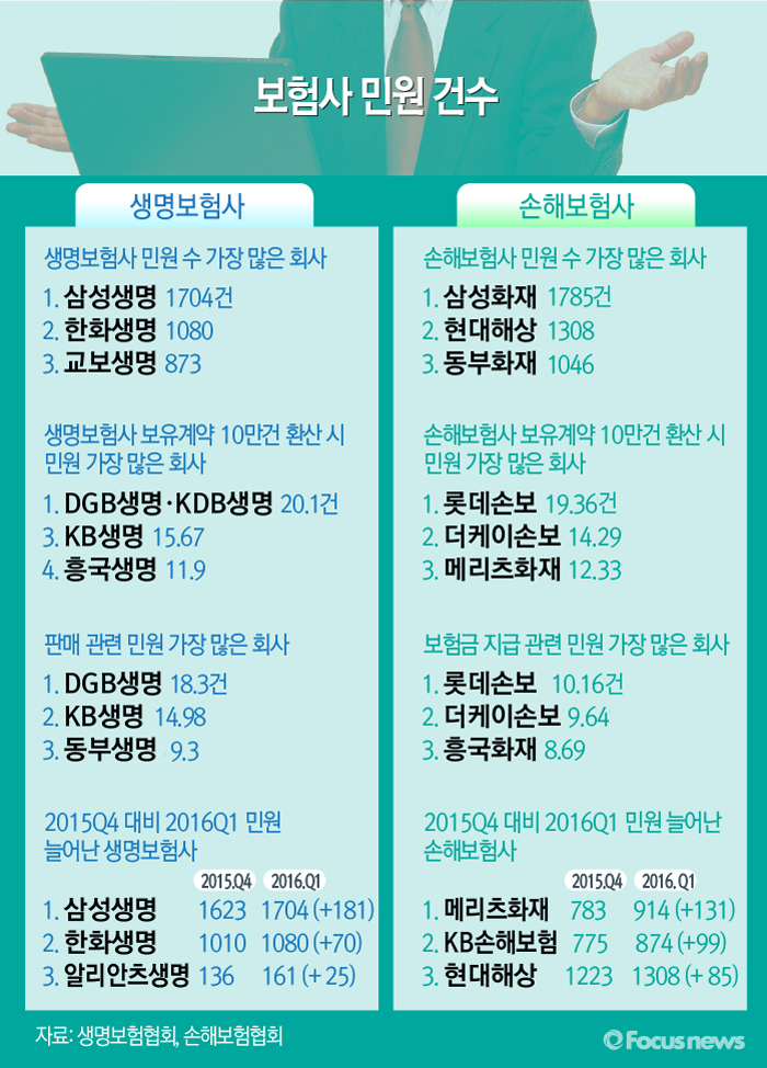 아직도 해결의 실마리가 보이지 않는 자살보험금 미지급 등을 조사했던 한 금융감독당국 관계자는 "자살보험금 미지급 건수에 대해 일부 보험사 대표들도 가입자와의 신뢰도를 저버리면 안된다는 목소리가 나오기도 했다"라며 "가입자보다 훨씬 우위에 있는 보험사가 자정노력을 해야 보험회사에 대한 긍정적인 평가가 나올 것"이라고 말했다.(서울=포커스뉴스) 생명보험협회와 손해보험협회에 공시한 국내 생명보험사(생보사)와 손해보험사(손보사)의 자율 민원 공시 자료를 분석한 결과 민원 건수가 2015년 4분기 대비 2016년 1분기 증가 건이 가장 높은 생보사는 삼성생명이며, 손보사는 메리츠화재인 것으로 나타났다. 작년 4분기 삼성생명의 고객 민원은 1623건이다. 메리츠화재가 작년 4분기 대비 올해 1분기 민원 수가 131건이나 늘었다. 작년 4분기 민원 수는 783건이었으나 올 1분기 914건으로 늘었다. 2016.07.20 김일환 기자