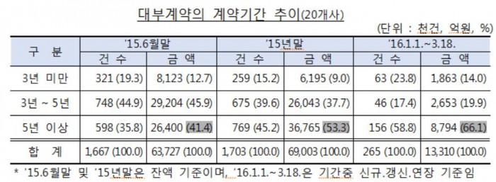실제 금감원이 공개한 바에 따르면 20개 대부업체 중 지난 3월 3일 법정 최고 금리 이후 체결된 전체 계약 중 계약기간이 5년 이상인 비중은 2015년 6월말 41.4%, 2015년말 53.3%였지만, 2016년 3월 중 (2016년 1월 1일~3월 18일)까지 66.1%로 대폭 늘었다. 법정 최고 금리는 2014년 4월 연 34.9%에서 2016년 3월 연 27.9%로 7%포인트 하락했다.