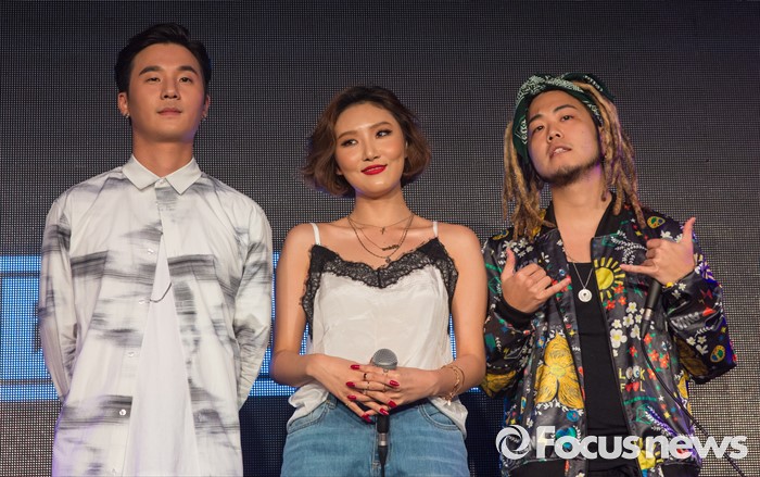 (서울=포커스뉴스) '쇼미더머니4' 우승자 래퍼 베이식이 1일 오후 서울 용산구 현대카드 언더스테이지에서 열린 첫 번째 미니앨범 'Nice' 발매 기념 쇼케이스에 참석해 마마무 화사, 래퍼 G2와 함께 포즈를 취하고 있다.