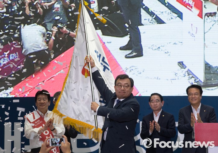 (서울=포커스뉴스) 9일 오후 서울 송파구 잠실실내체육관에서 열린 새누리당 4차 전당대회에서 신임 당대표로 선출된 이정현 의원이 당기를 흔들고 있다.